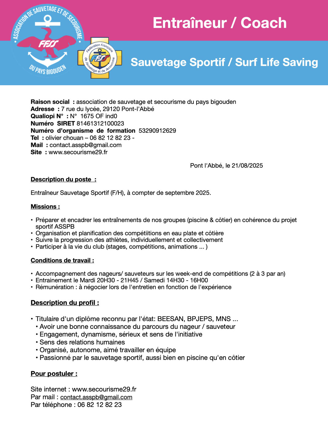 A la suite de votre candidature, vous serez convoqué à des tests de sélections afin d'évaluer vos capacités dans les domaines du sauvetage et du secourisme. Ces tests sont obligatoires et se dérouleront le samedi 5 avril 2025 à la plage de Tronoën. Suite à votre candidature, une convocation vous sera envoyée précisant les modalités.